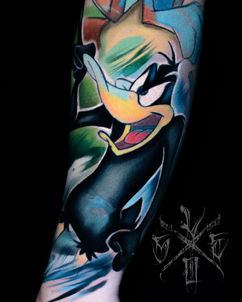 W tego typu pracach najbardziej cenię walor trybutu. Staram się odwzorować styl oryginalnego twórcy – kreskę, kolory, proporcje, ekspresję – tak, aby projekt pozostał wierny źródłu. Jednocześnie pozwalam sobie na autorskie rozwiązania: inne kadrowanie, dodatkową kompozycję, środki malarskie, mieszanie stylu czy dopisanie elementów, które budują własny klimat. Dzięki temu tatuaż staje się jednocześnie hołdem i oryginalną pracą dopasowaną do osoby, która będzie go nosić.